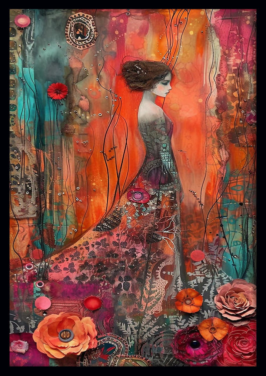 Elegant Woman in Floral Dreamscape – Mixed Media Canvas Art Print – T893 – AiPrintLab