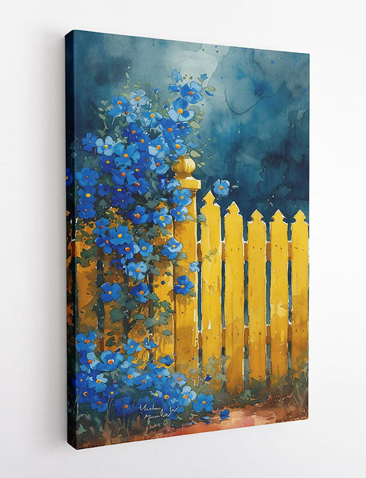 Golden Fence with Blue Flowers – Watercolor Floral Poster & Canvas Wall Art – T833 – AiPrintLab