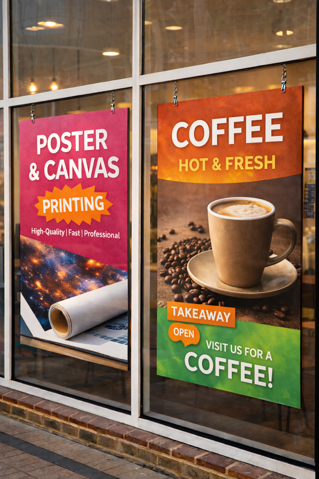 We produce posters and canvas artwork for shop windows, events, cafés, offices, and promotional displays. Our large-format printing is available in A4 to A1 sizes, framed or unframed, and carefully checked before printing.