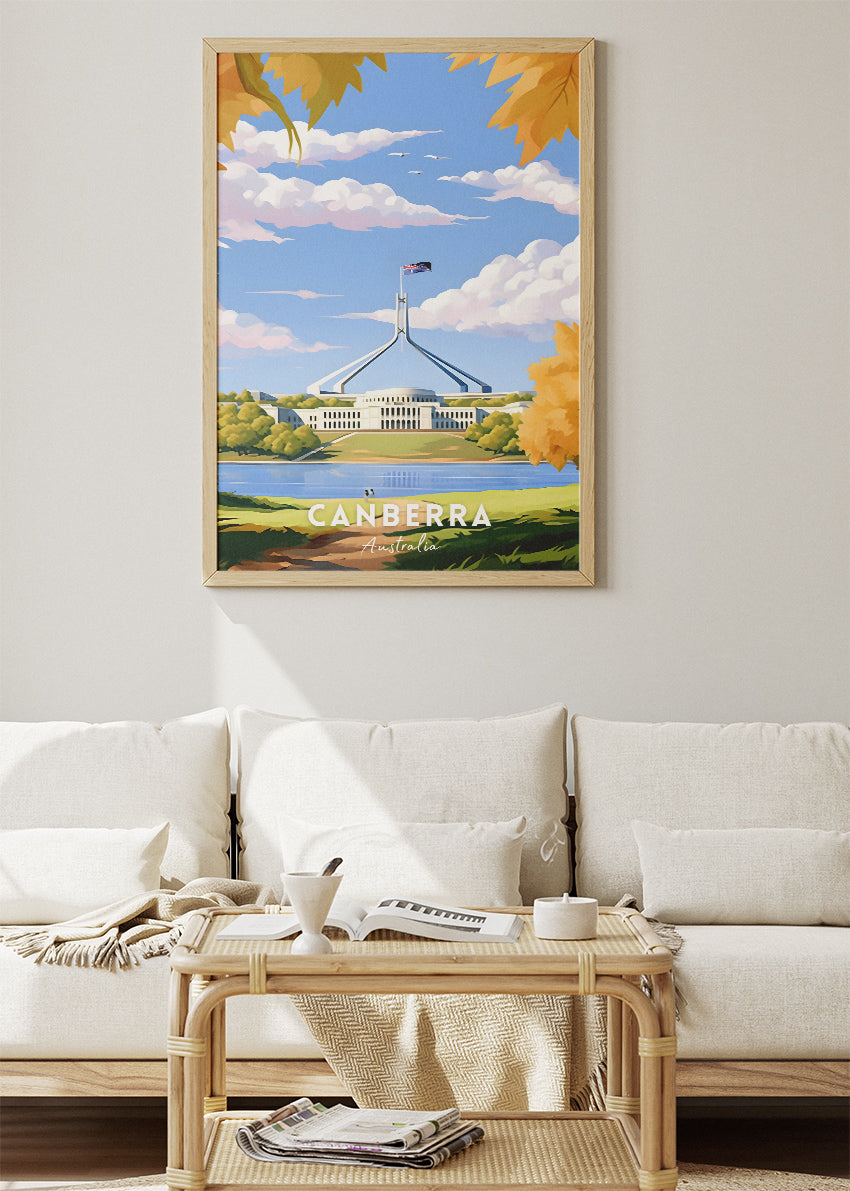 A beautifully illustrated Canberra travel poster featuring Parliament House, soft skies, and golden autumn trees. A perfect modern wall art piece for any home or office.
