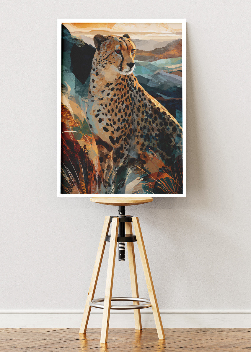 A striking modern illustration of a cheetah set against layered mountain landscapes and warm earthy tones. This artwork blends strength, elegance, and natural beauty, creating a bold yet refined statement piece for living rooms, bedrooms, offices, or contemporary interiors. Available as a premium poster or high-quality canvas print.