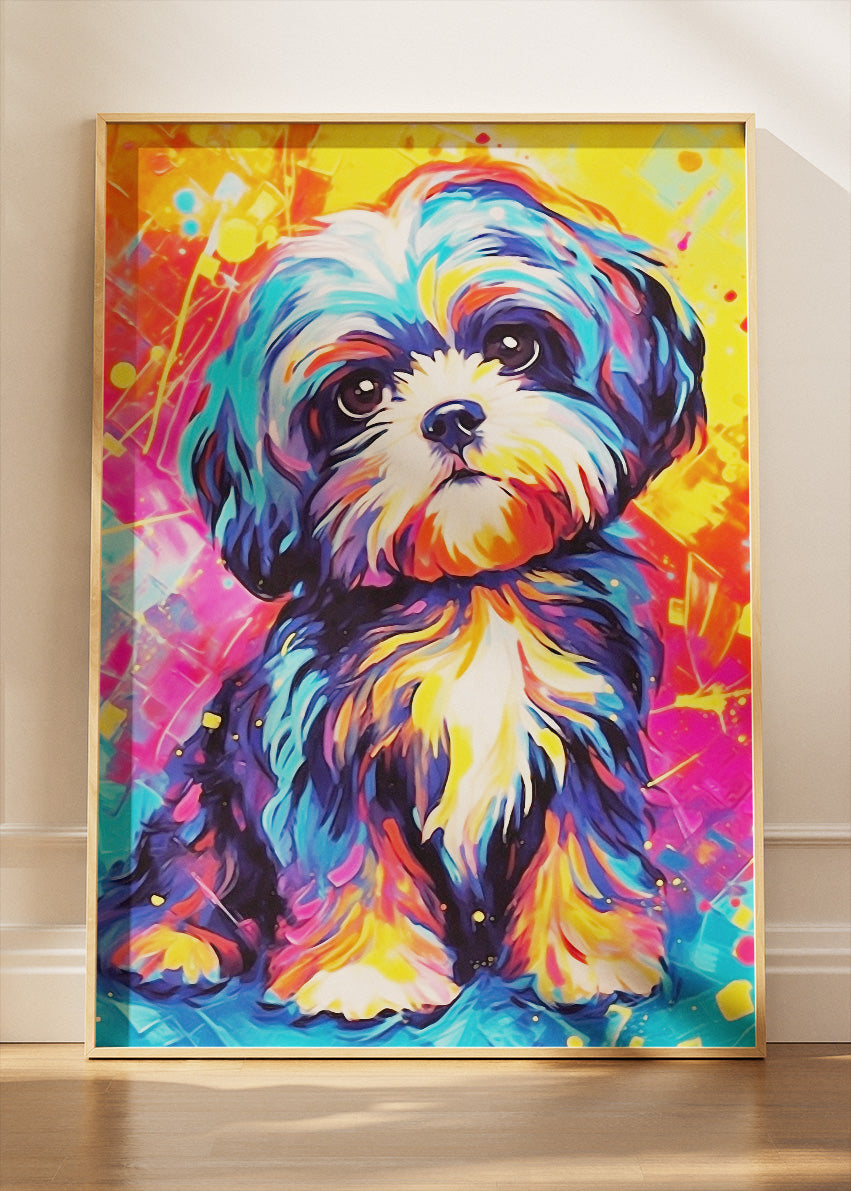 A lively and vibrant Shih Tzu artwork bursting with bold colours and playful pop-art energy. This eye-catching dog illustration brings joy, character, and modern style to any room — perfect for pet lovers, kids’ rooms, living spaces, or creative studios. Available as a premium poster or high-quality canvas print.