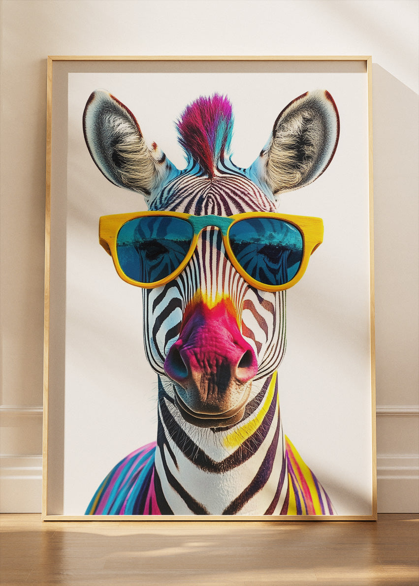 A bold, colourful zebra wearing sunglasses, designed in a clean modern pop-art style with a bright white background.