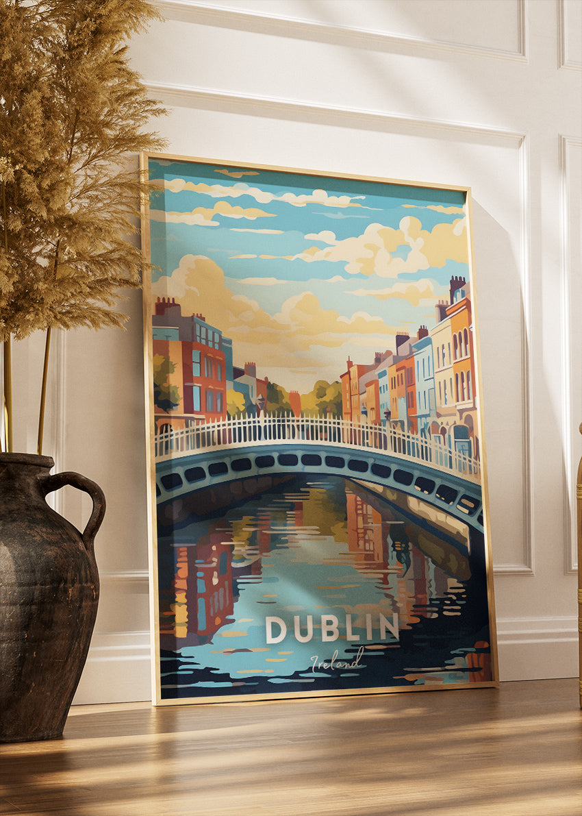 A vibrant illustrated Dublin poster showcasing the iconic Ha’penny Bridge, colorful Georgian buildings, and calm river reflections. Captured in a warm, artistic palette, this artwork brings the charm and character of Ireland’s capital city into your home. Perfect for living rooms, offices, and travel-themed décor.