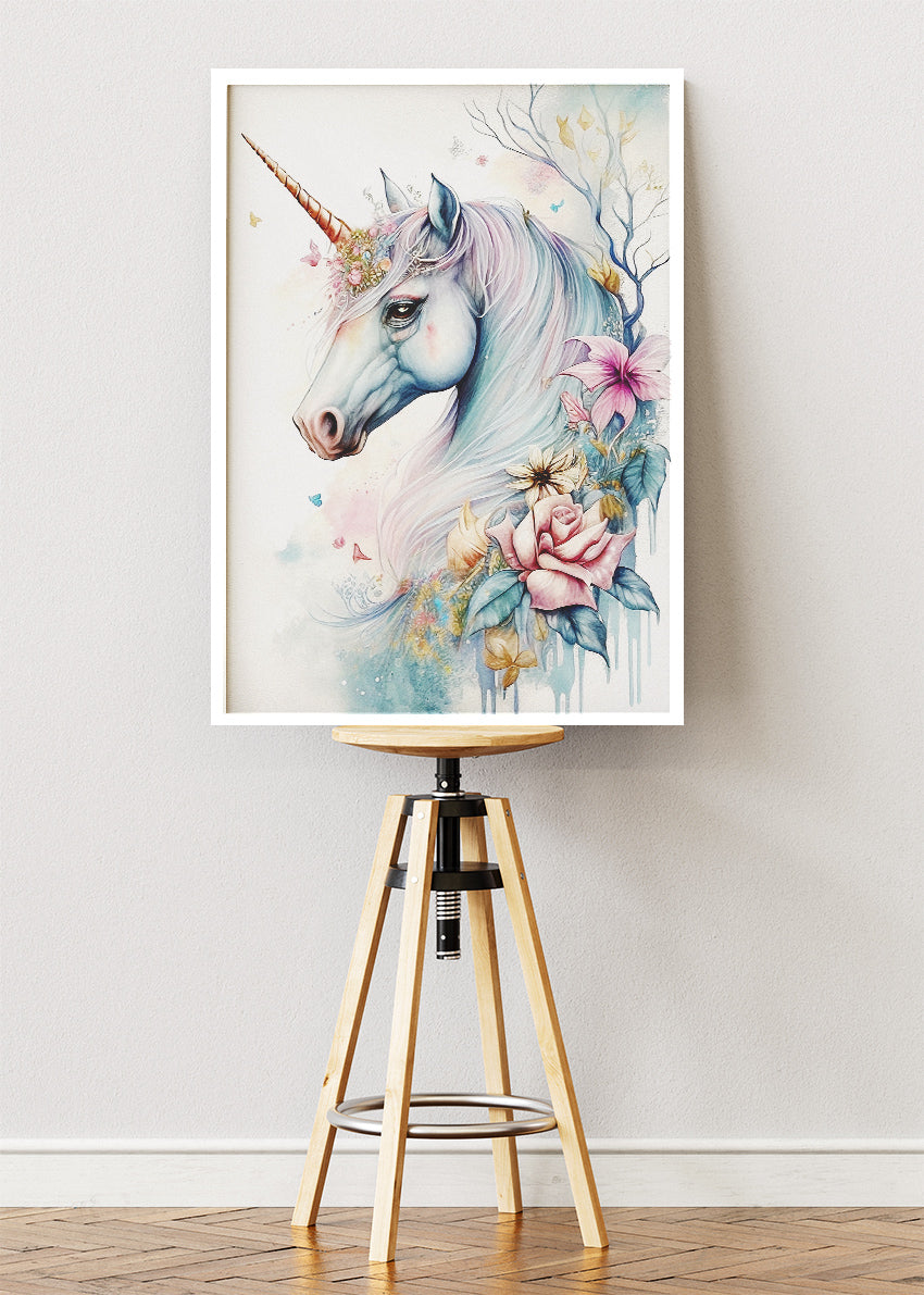 A dreamy pastel unicorn artwork adorned with delicate flowers, soft watercolor textures, and gentle fantasy tones. This elegant and whimsical illustration brings a magical, calming atmosphere to bedrooms, nurseries, and creative spaces. Available as a premium poster or high-quality canvas print.