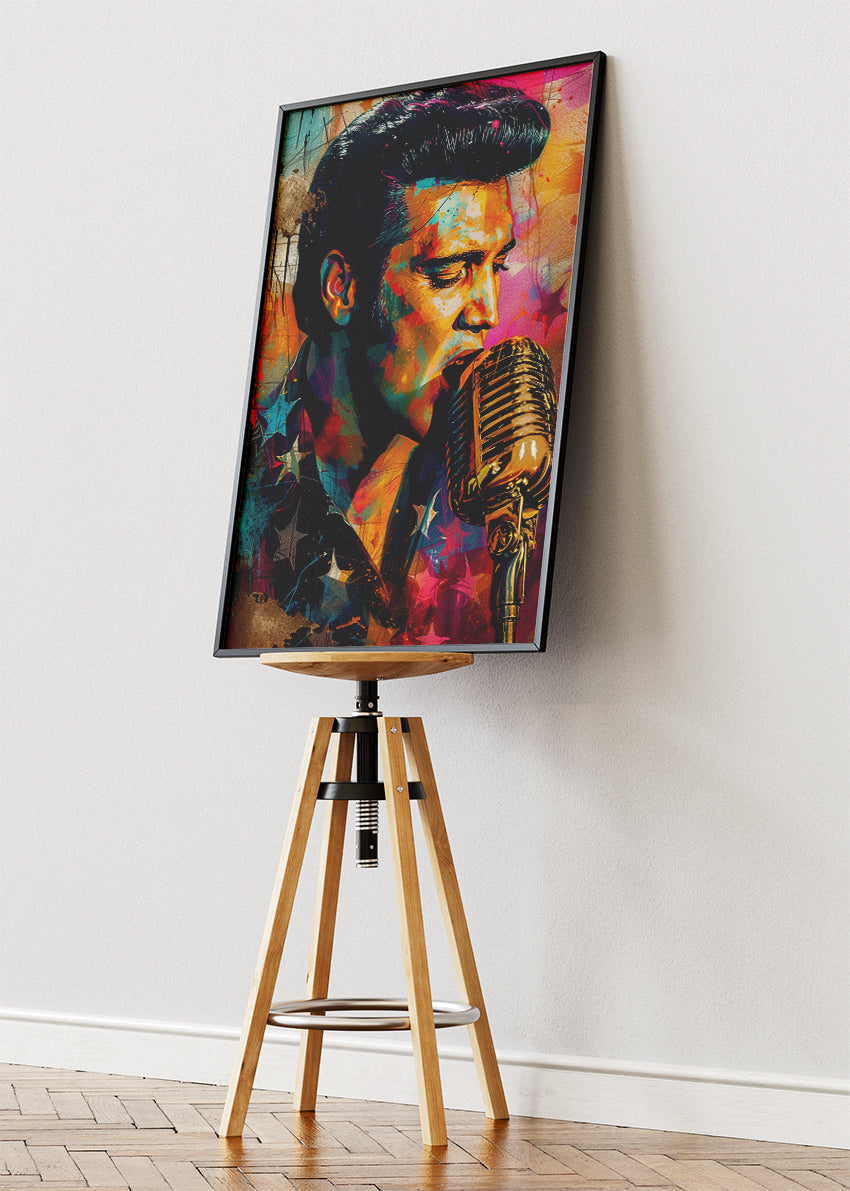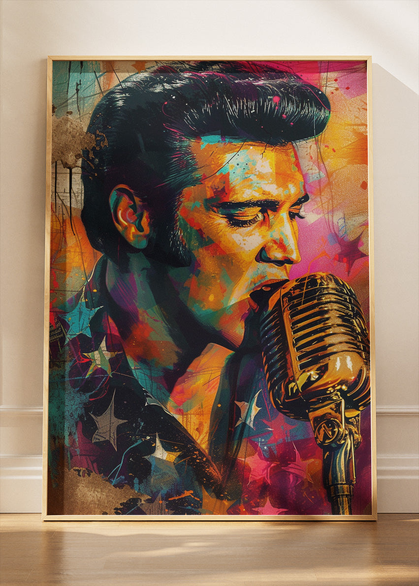 A vibrant portrait inspired by Elvis Presley, captured mid-performance with a classic vintage microphone. Rich retro colours and expressive brush textures bring the energy of rock and roll to life. A striking statement piece for music lovers, studios, and modern interiors.