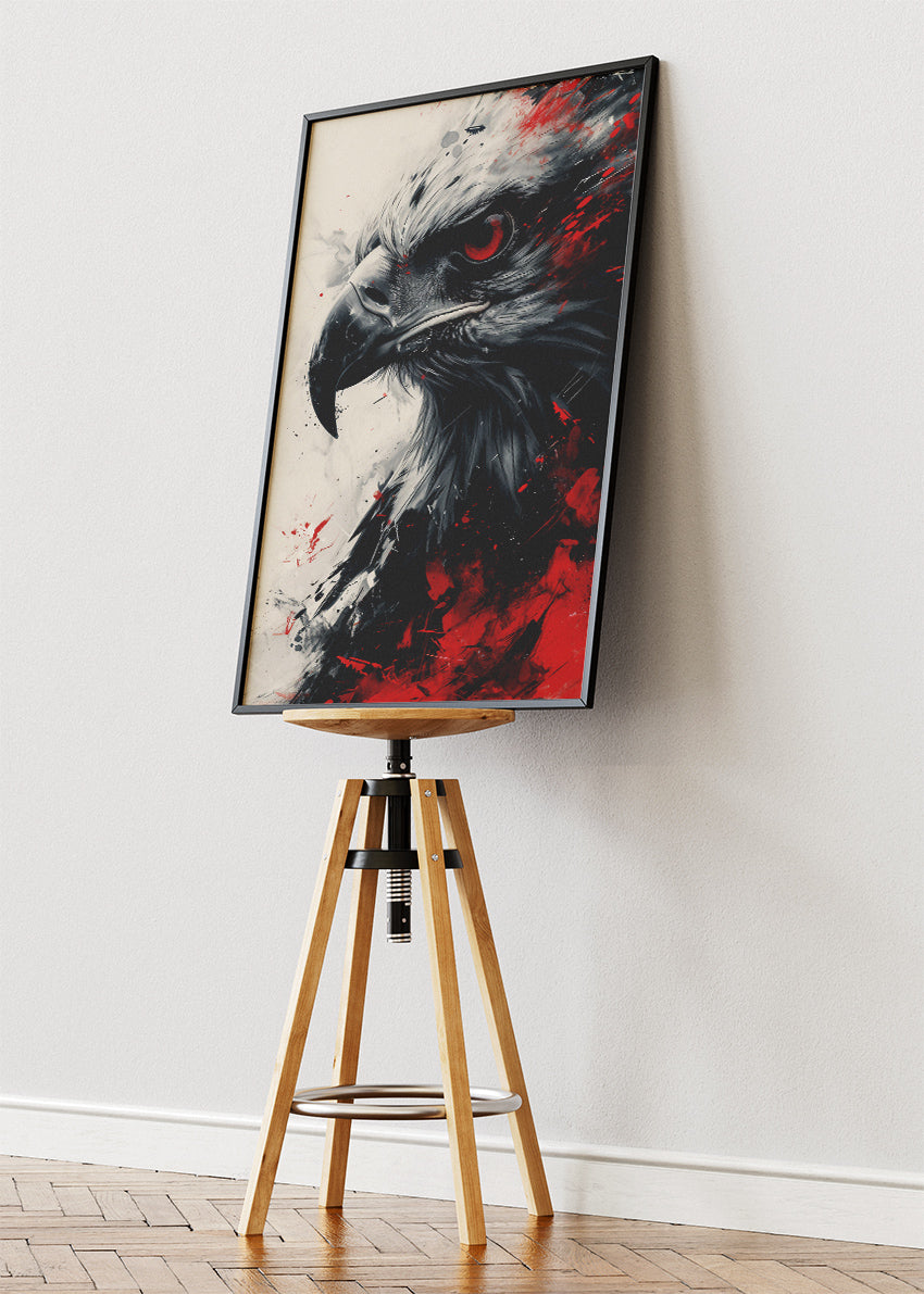 A dramatic eagle portrait with piercing red eyes and bold black and crimson paint splashes, creating a powerful and intense modern wildlife artwork.