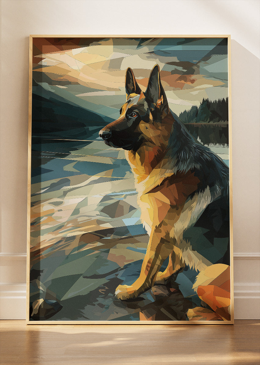A striking modern illustration of a German Shepherd standing proudly by a calm lake, rendered in bold geometric shapes and layered earthy tones. This artwork captures strength, loyalty, and intelligence, making it a perfect statement piece for living rooms, offices, or dog-lover interiors. Available as a premium poster or high-quality canvas print.