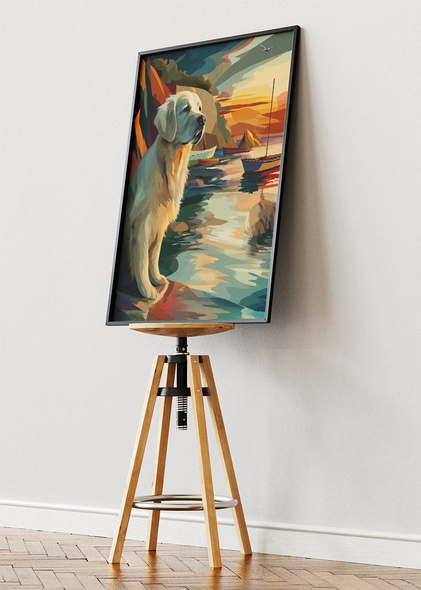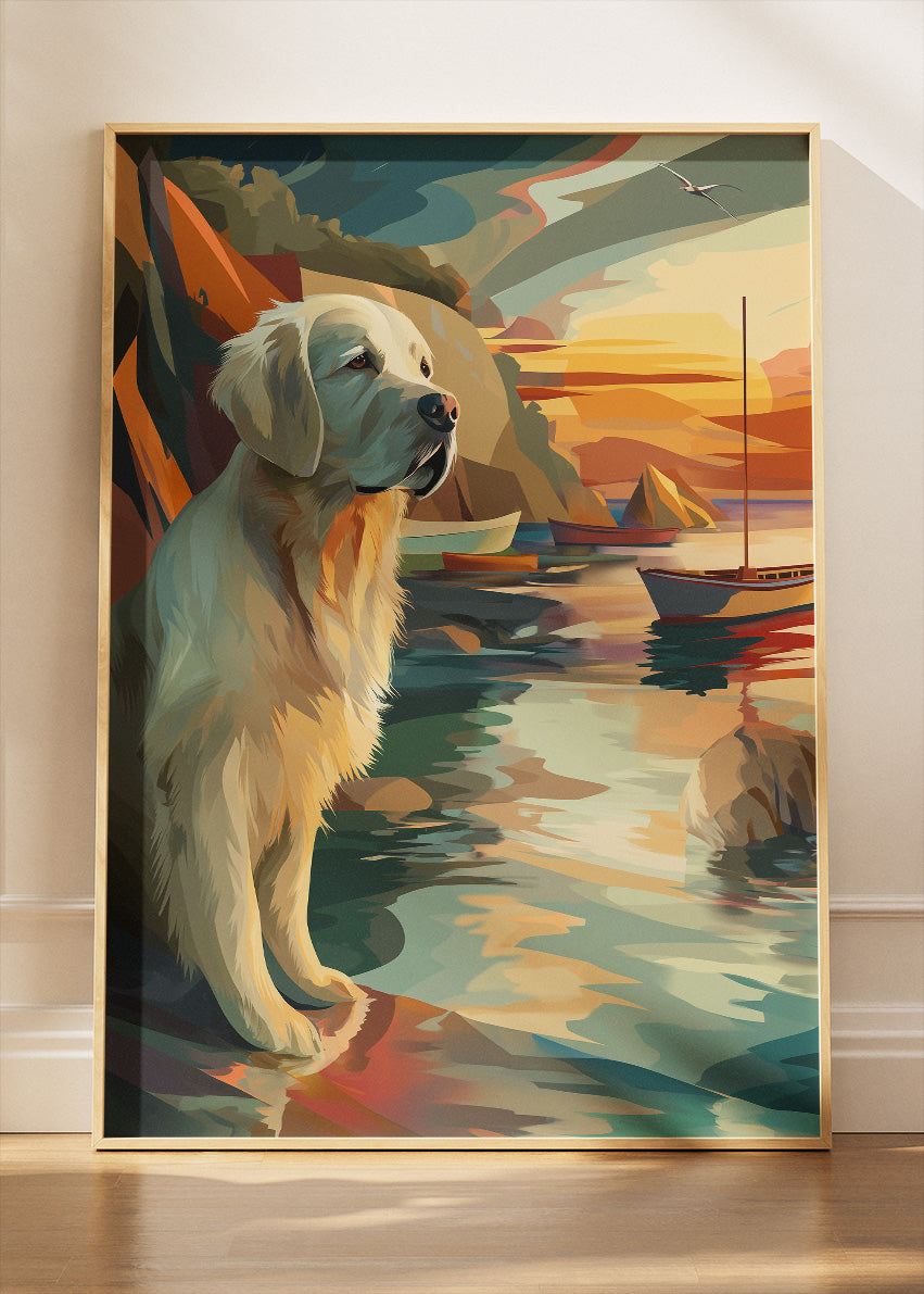 A peaceful golden retriever standing by the sea at sunset, painted in warm coastal tones with boats and reflections creating a calm and elegant atmosphere.