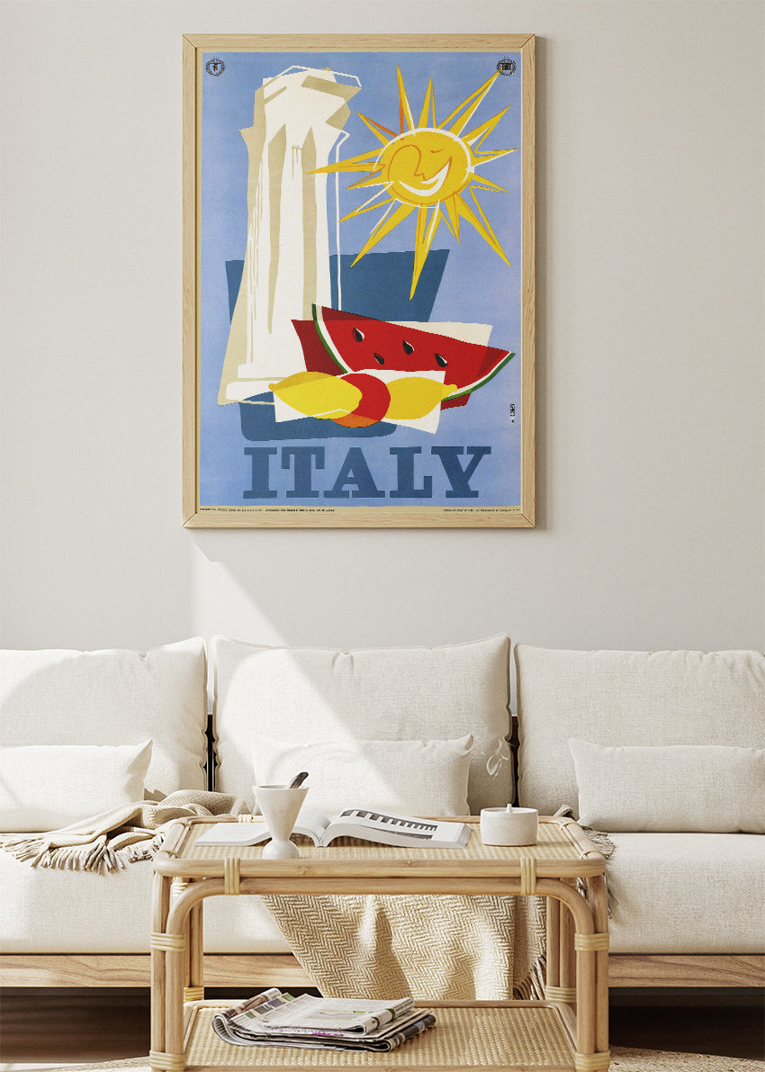 A bold vintage-style Italy poster featuring an abstract sun illustration, bright Mediterranean colours, a stylised tower, and classic summer fruits including watermelon and citrus. The retro travel aesthetic captures Italy’s warm, joyful holiday spirit with a clean mid-century graphic style. Perfect for adding a playful, sunny Mediterranean vibe to your kitchen, dining area, living room, or studio. Available as a premium poster or high-quality canvas print.