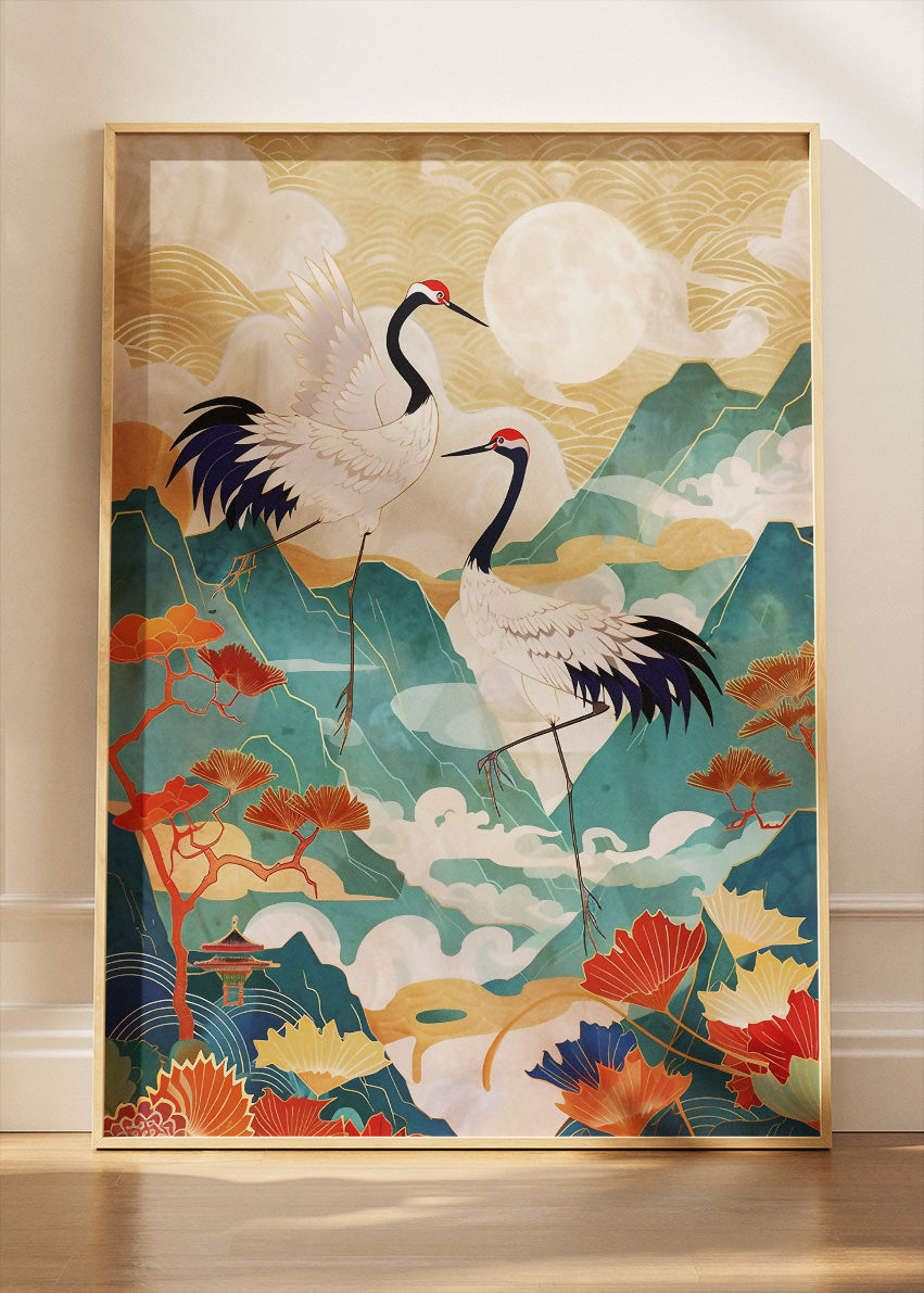 A beautifully detailed Japanese-style artwork featuring two graceful cranes soaring above layered mountains, golden clouds, and vibrant floral patterns. Inspired by traditional washi textures and classic East Asian motifs, this elegant piece brings serenity, balance, and timeless beauty to any living space. Perfect for bedrooms, living rooms, studios, or meditation areas. Available as a premium poster or high-quality canvas print.
