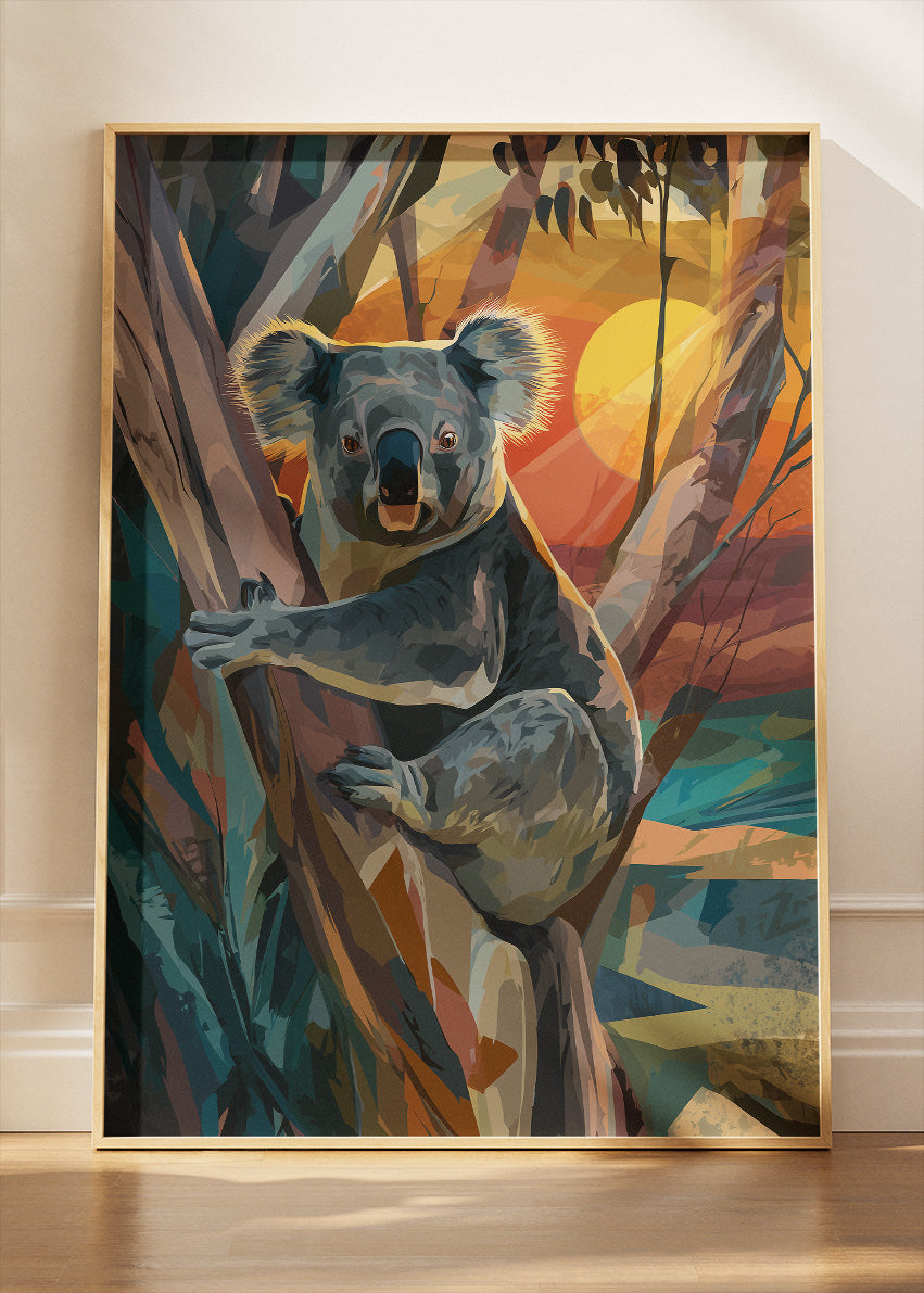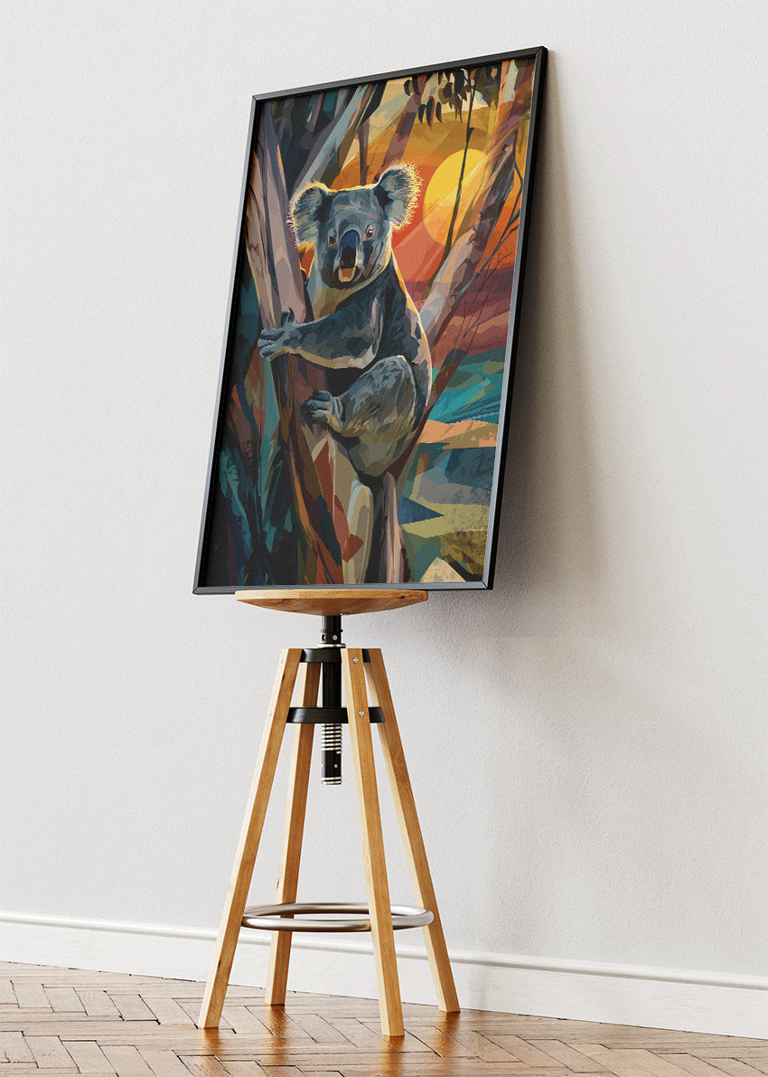 A vibrant and expressive koala artwork set against a glowing sunset in the Australian forest. Rich painterly textures, warm colours, and geometric brush shapes bring this gentle animal to life. Perfect for wildlife lovers or anyone wanting a colourful, nature-inspired statement piece for their home or office. Available as a premium poster or high-quality canvas print.