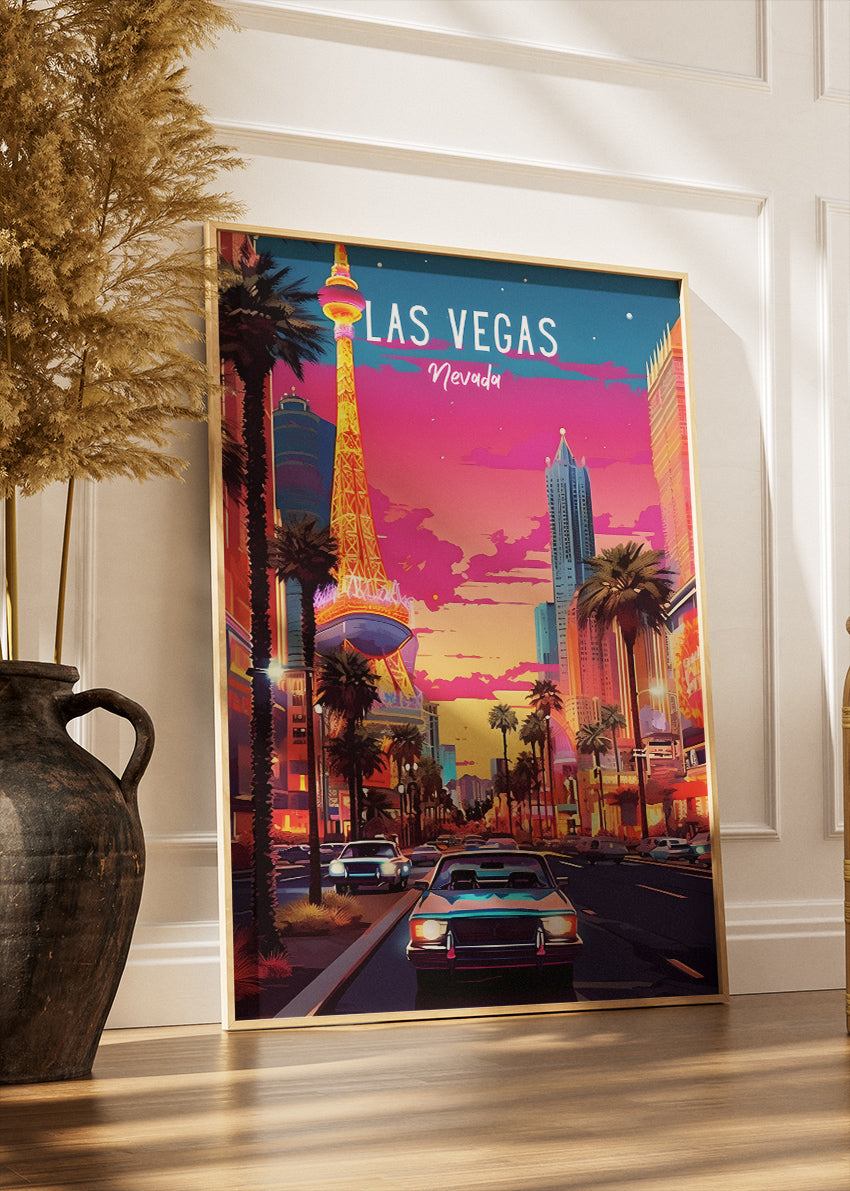 A vibrant illustrated Las Vegas poster capturing the iconic Strip glowing under a dramatic neon sunset sky. Palm trees, casinos, colorful hotel lights, and a retro convertible cruising down Las Vegas Boulevard create an electrifying atmosphere full of movement and energy. Perfect for adding a bold, nightlife-inspired vibe to your living room, bar area, gaming room, or office. Available as a premium poster or high-quality canvas print.