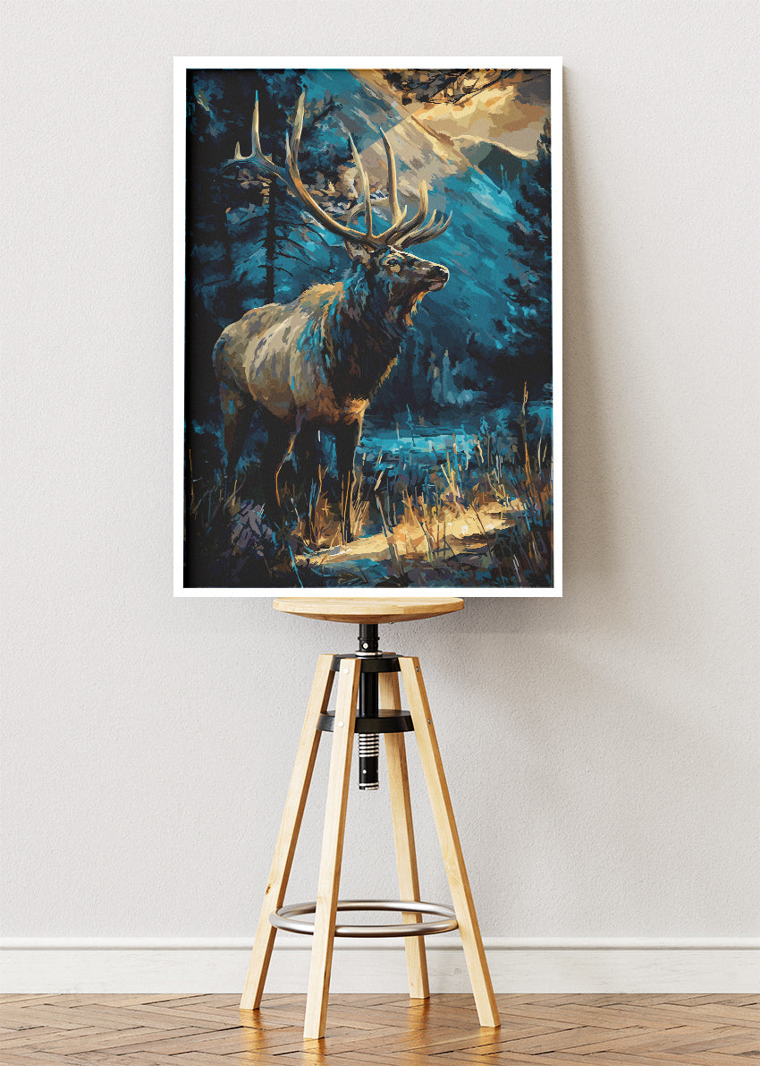 A powerful stag standing in a moonlit forest, painted in rich blue and golden tones for a dramatic and elegant wildlife artwork.