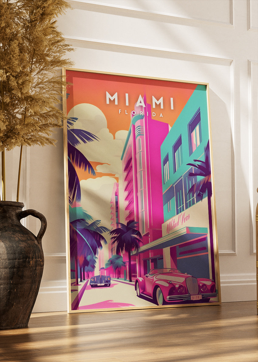 A bold and colorful illustrated Miami poster showcasing the famous Art Deco district with vibrant pink, teal, and sunset tones. Palm trees frame the stylish pastel buildings while a classic retro convertible cruises through Ocean Drive, capturing Miami’s glamorous nightlife and beachside charm. Perfect for adding a lively, tropical aesthetic to your living room, bedroom, studio, or entertainment space. Available as a premium poster or high-quality canvas print.