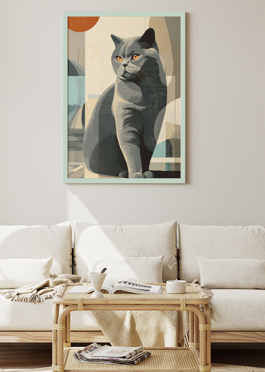 A refined abstract illustration of a grey cat, combining soft geometric shapes with muted, modern tones. The confident pose and warm amber eyes create a calm yet expressive focal point. This minimalist feline artwork is perfect for contemporary interiors, adding elegance and quiet character to living rooms, bedrooms, offices, or studios. Available as a premium poster or high-quality canvas print.
