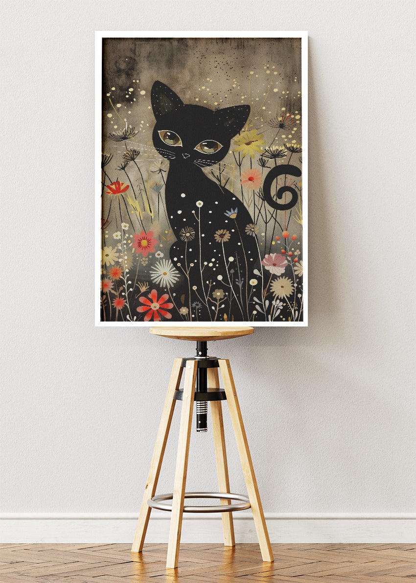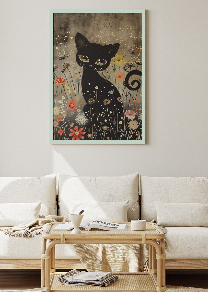 Mystical Black Cat in Wildflowers Canvas Print & Poster – Enchanted Animal Wall Art