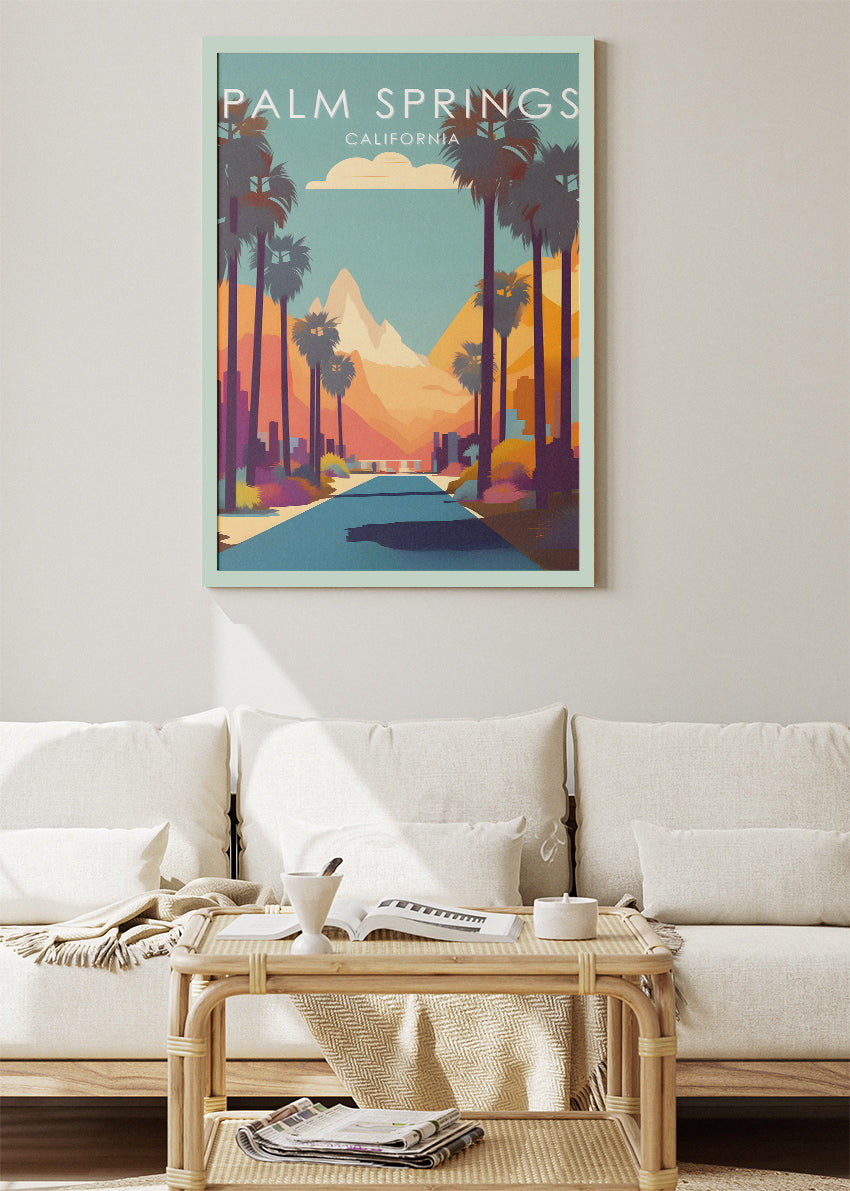 A vibrant Palm Springs poster featuring a dreamy desert highway lined with tall palm trees, glowing mountains, and warm sunset tones. The bold retro-modern color palette creates a striking California aesthetic, blending teal skies, golden light, and soft pastels for a stylish and uplifting vibe. Perfect for adding a sunny, relaxed, and artistic touch to any room. Available as a premium poster or high-quality canvas print.