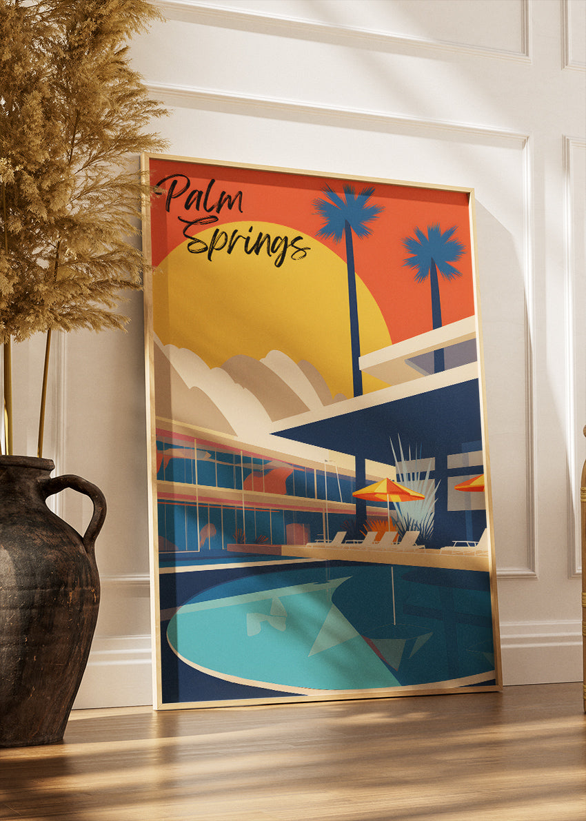 A bold retro-style Palm Springs poster showcasing a sun-soaked poolside scene with vibrant oranges, deep blues, mid-century architecture, tall palms, and a glowing desert sunset. The crisp geometric lines and vintage color palette create a stylish, nostalgic California vibe. Perfect for adding a warm, summery, and modern aesthetic to your living room, bedroom, office, or studio. Available as a premium poster or high-quality canvas print.