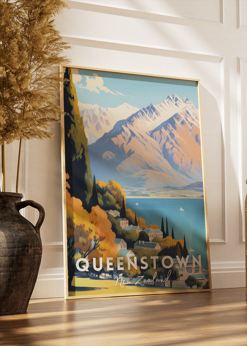 A breathtaking illustrated Queenstown poster featuring snow-capped mountains, a serene blue lake, lush autumn trees, and charming hillside houses. This stunning artwork captures the dramatic natural beauty of New Zealand’s most iconic alpine town—perfect for adding a peaceful, scenic, and refreshing landscape vibe to your living room, bedroom, hallway, or studio. Available as a premium poster or high-quality canvas print.