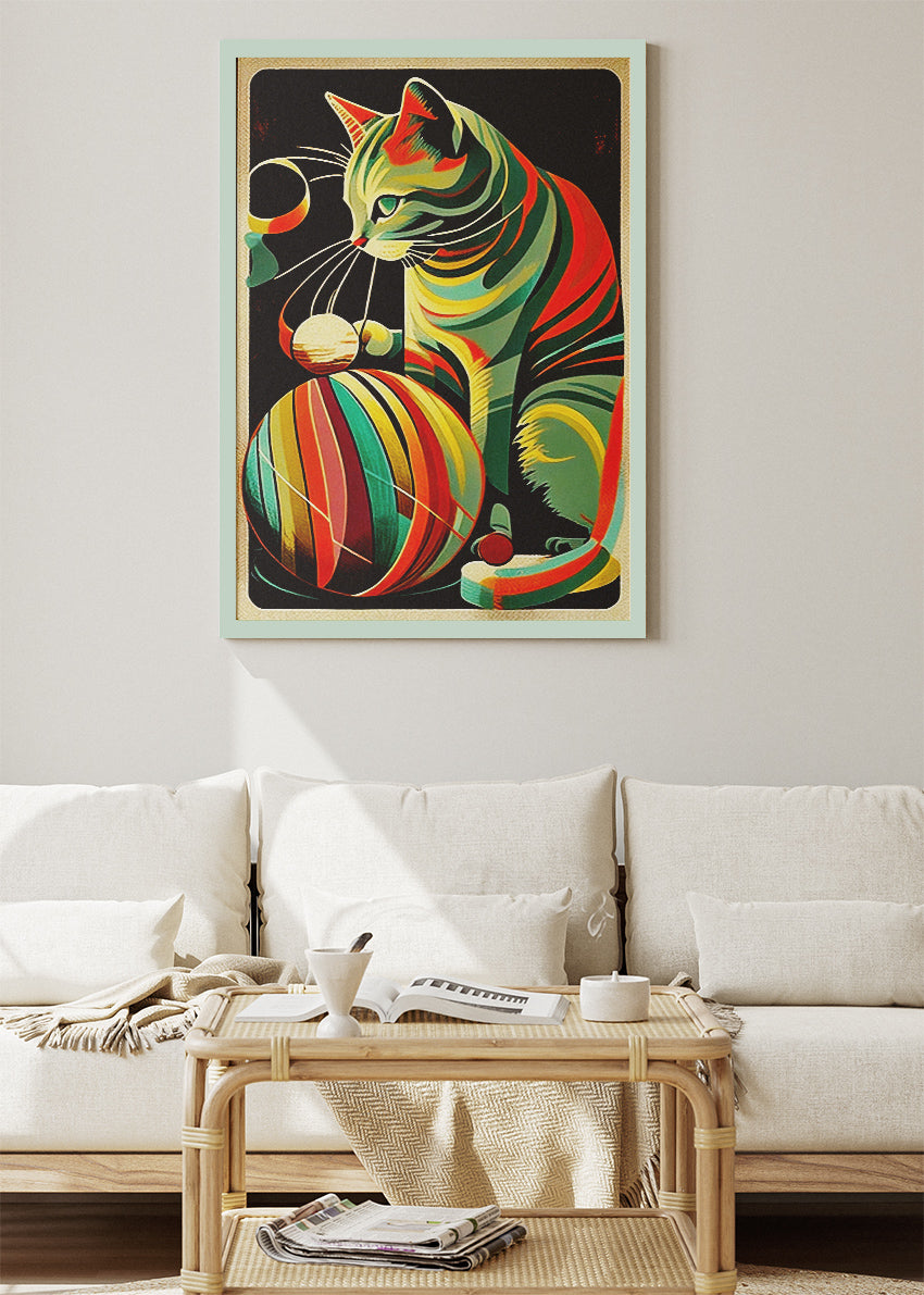 A striking retro-style illustration of a striped cat playing with a vibrant patterned ball. Rich reds, greens, and gold tones combine with bold geometric curves to create a playful yet elegant mid-century modern look. This artwork adds personality, warmth, and artistic flair to any space, making it perfect for living rooms, creative studios, bedrooms, or modern interiors. A must-have piece for cat lovers and fans of bold, colorful design. Available as a premium poster or high-quality canvas print.
