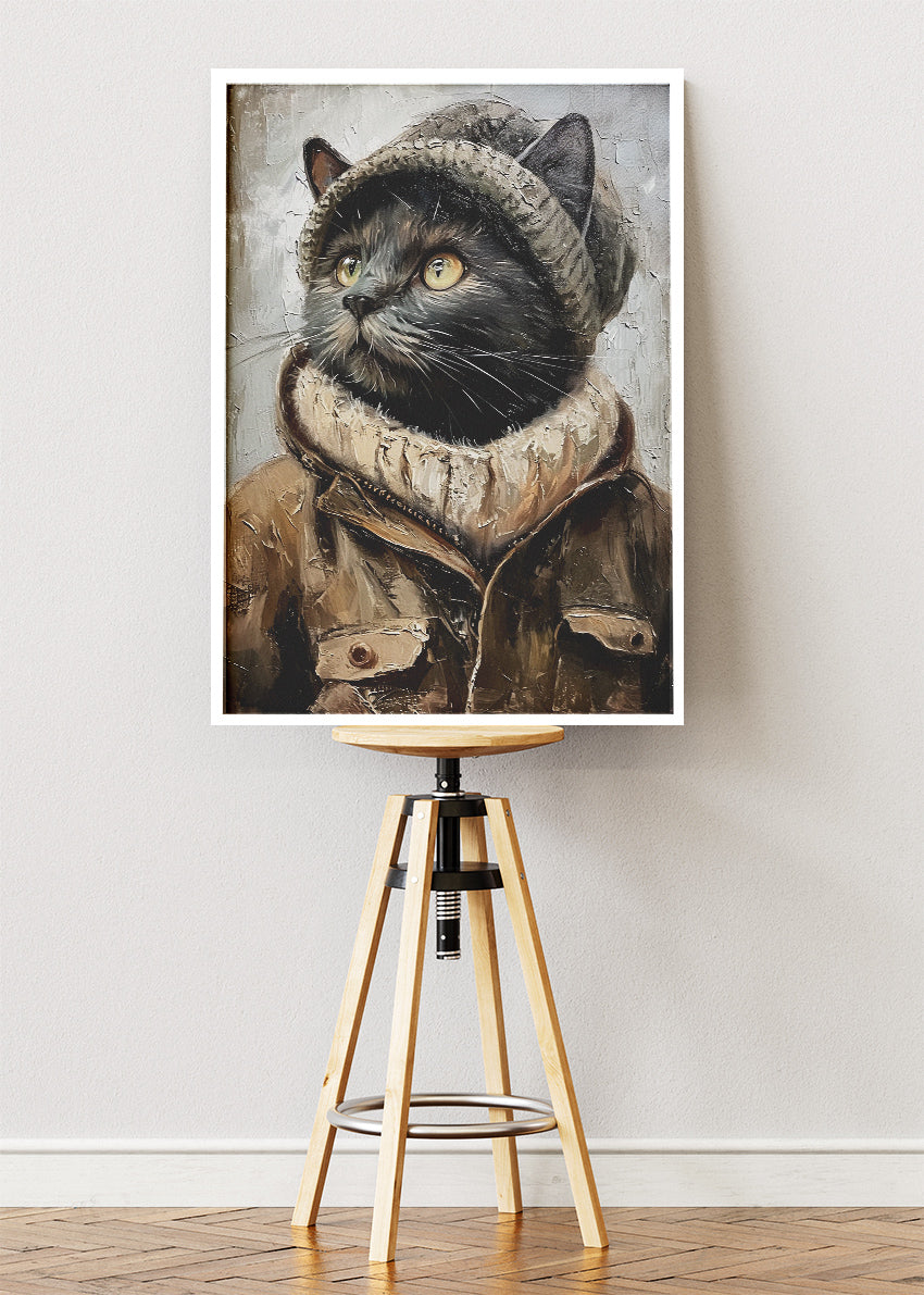 A fashionable black cat dressed in a winter jacket and knit hat, painted with rich textured brush strokes. This charming artwork blends warmth, style, and personality for a cozy modern interior.