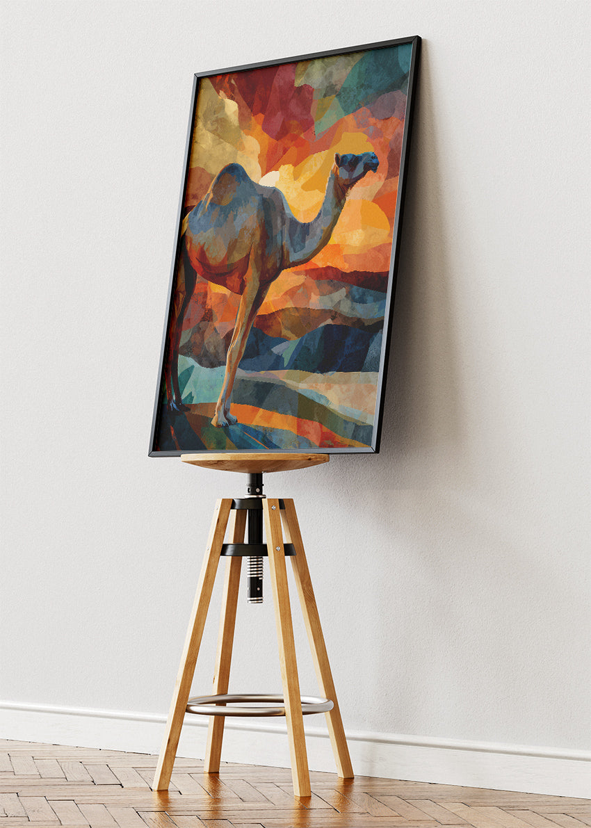 A captivating camel illustration set against a vibrant desert sunset, painted in bold layered colors and abstract geometric shapes. The warm orange sky and cool desert tones create a stunning balance, making this artwork perfect for adding warmth and wanderlust to any space. Available as a premium poster or high-quality canvas print.