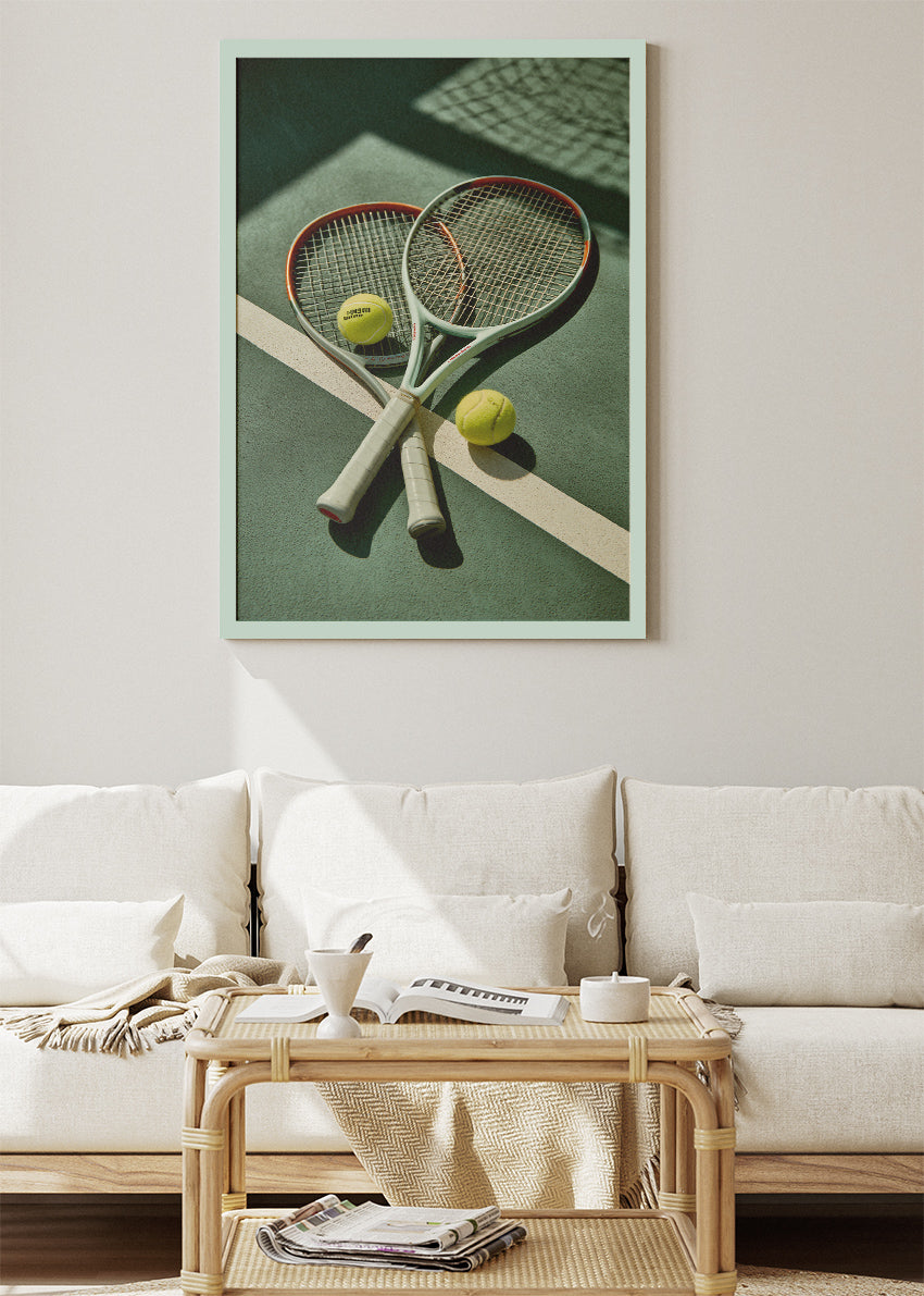 Tennis Rackets on Court Wall Art Poster & Canvas Print – Modern Sports Decor