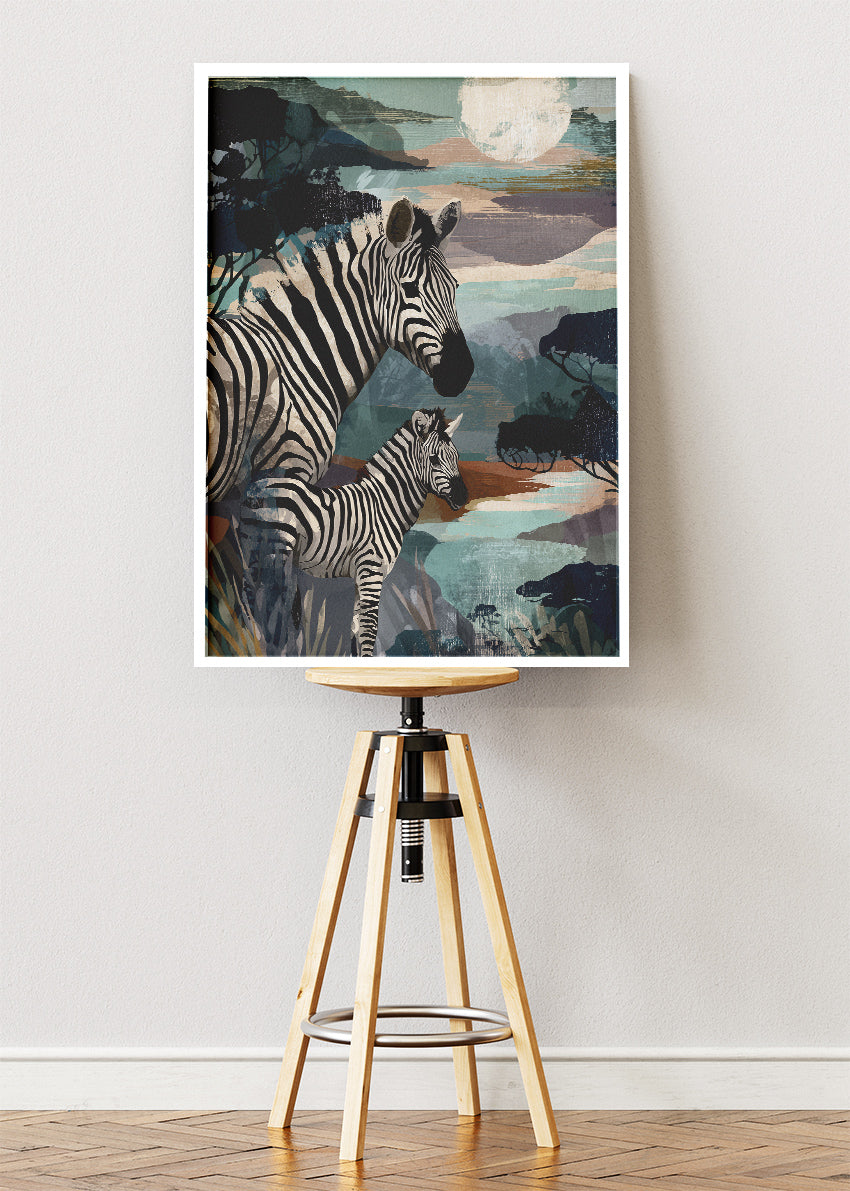 A beautifully composed modern safari artwork featuring a zebra mother and her calf set against a textured African landscape. Soft teal, sand, and dusk tones blend with painterly brush textures to create a calm, atmospheric scene. The contrasting black-and-white stripes make the zebras stand out elegantly, giving the piece a warm and soulful feel. Perfect for adding a serene wildlife touch to any living room, bedroom, or office. Available as a premium poster or high-quality canvas print.